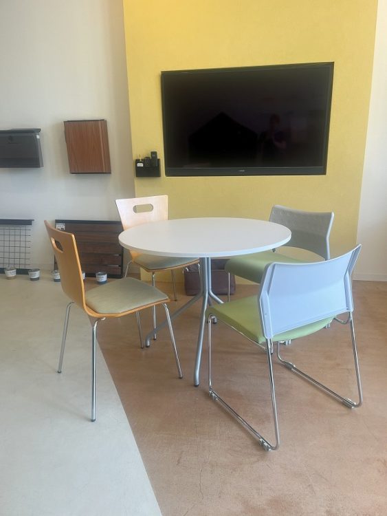 ↑入り口近くの打ち合わせスペースは光が差し込み明るい雰囲気。