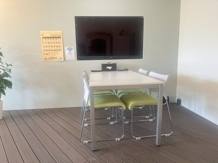 ↑もう一つのスペースは人工木ウッドデッキの上で打ち合わせできます。