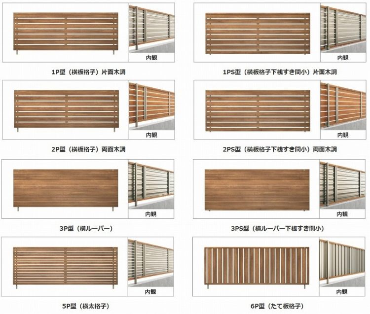 片面木調の1型、両面木調の2型、ルーバータイプで目隠しできる3型、細かい横格子の5型、縦格子の6型があります。
