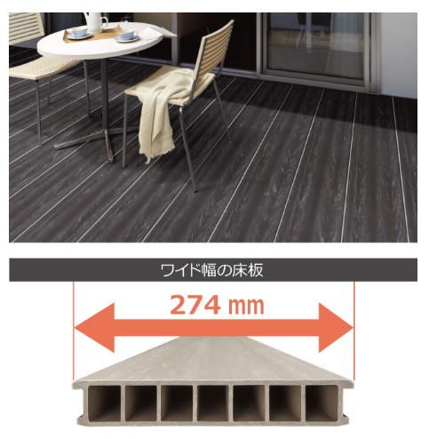 こちらは、上記で紹介してきた人工木デッキと比べて大きくデザイン面に特長があり、ウッドデッキというよりは、モダンでシックな新感覚の屋外フローリングとなっております。