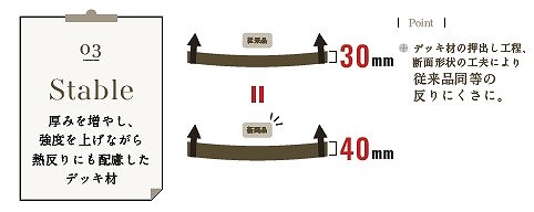 人工木デッキの最大の課題ともいえる反り・変形に今まで以上に配慮されたのはとても大きなリニューアルです。