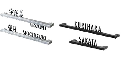 ステンレス(ヘアライン)レザーカット切り文字タイプとネームシートから選べます。