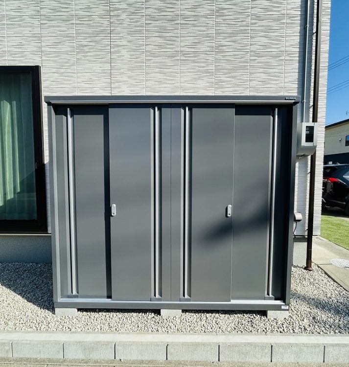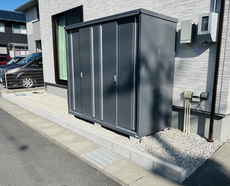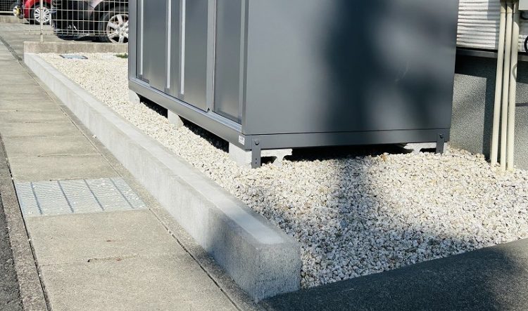 土留めした砕石スペースに屋外で使用するものを収納できる小型物置を設置しました。