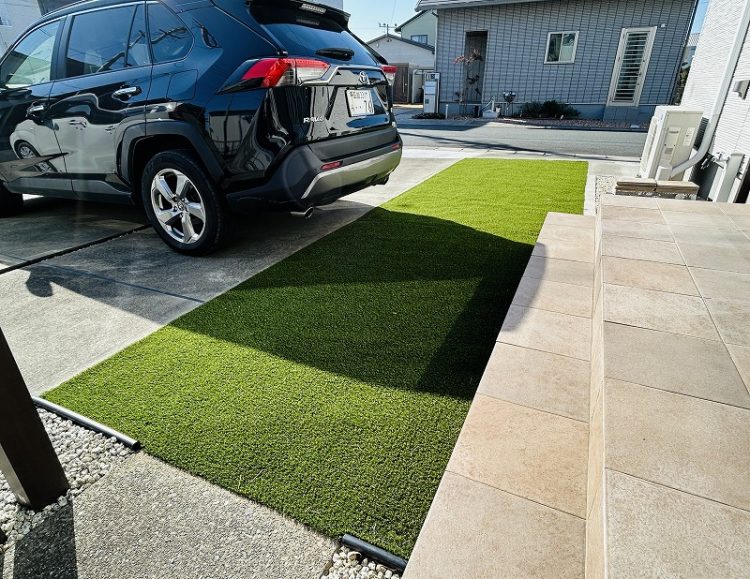 タイルデッキ前に施工されていた天然芝は人工芝でリフォームしました。お打合せ時には敷材かタイルで検討されていましたが、私としてはお庭に緑が無くなると景観がモダンになりすぎるからと思い人工芝をご提案しました。施工後には人工芝でよかったと喜んで頂きました。今回は2m×10m巻の人工芝を用いてできる限りつなぎ目が無いように仕上げました。余った人工芝はタイルデッキ前の人工芝が劣化した際に使えるようお施主様にお渡ししました。