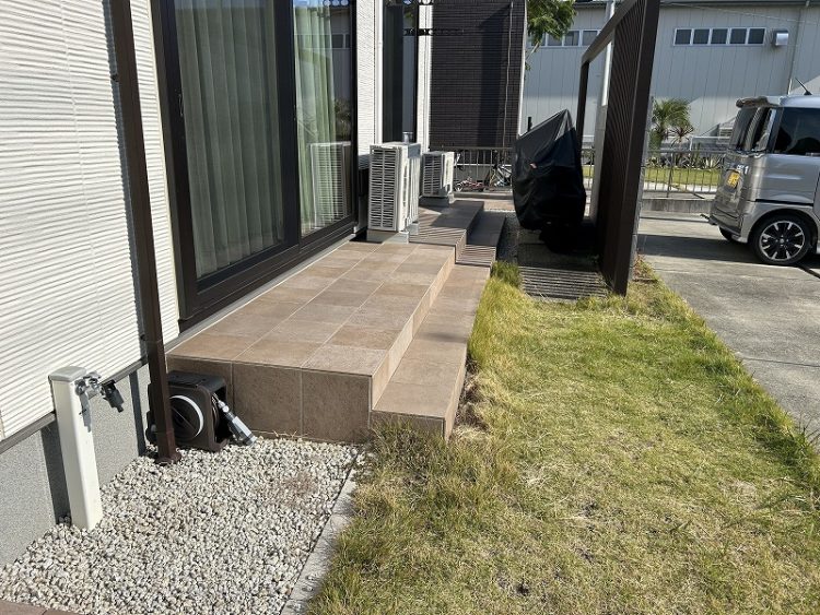 今回は【天然芝の管理が大変でリフォームしたい】【道路境界部分の砕石が道路にこぼれて清掃が大変】【小型物置が置けたらいいな】【駐車場角に設けた花壇を無くしたい】の4点をリフォームしました。