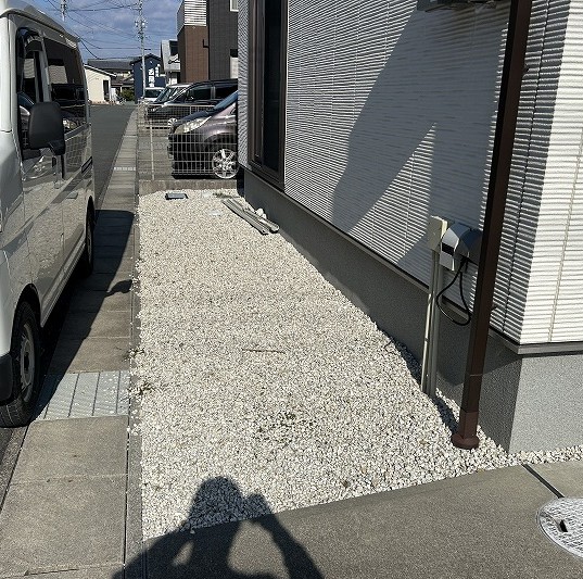 門廻りの雑草も手作業で整理して防草シートと砕石敷でリフォーム