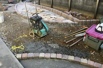 ふちを据え付けたら、通常サイズのレンガを敷き並べていきます。