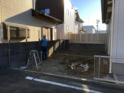 上の写真では、その後に水が溜まらないようにあらかじめ集水桝を設け、板塀フェンスの柱のみを先行して取付けをしています。