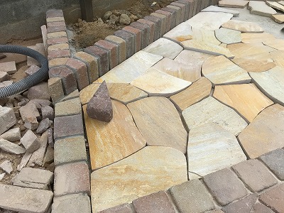 乱形の石張りの場合は1枚1枚、形を整えながらパズルのように張り合わせていきます。
