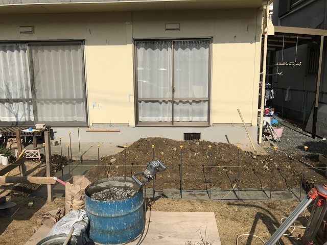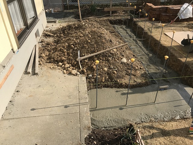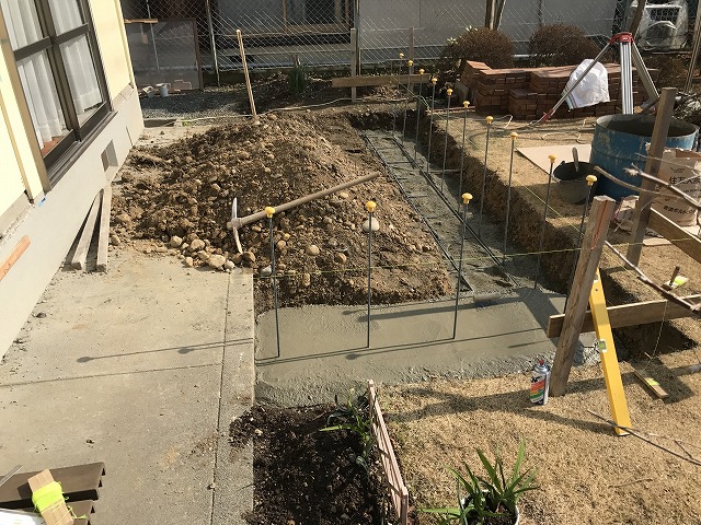 この後ブロック積みに入りますが、今回はこれまで。**コンクリが打ってある場合はアンカー(穴を開け鉄筋をいれます)