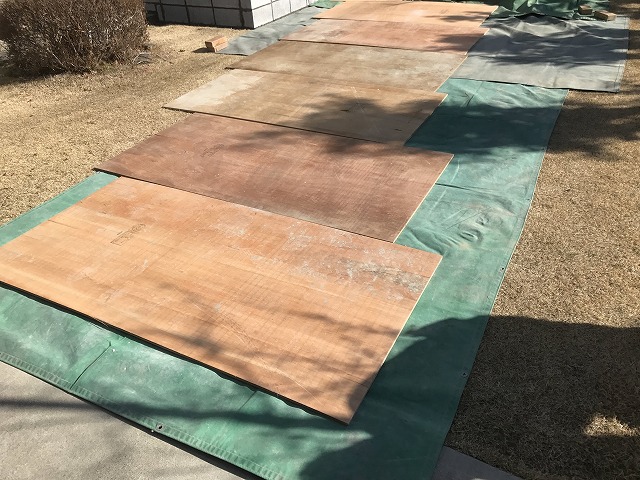 施工は庭なので、最初に庭(芝)の養生をします。今はまだ茶色の状態ですが、春~秋に養生しますと芝の状態が変わるので
