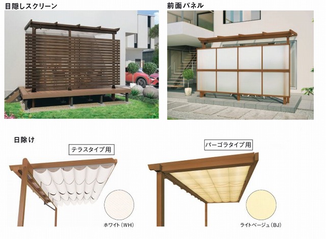 テラスタイプには折りたたみ式、パーゴラタイプにはメッシュ状の日除けがあります。