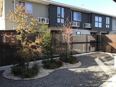 常緑樹1本と落葉樹2本、植栽廻りは低木で寄せ植えしました。