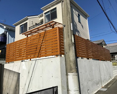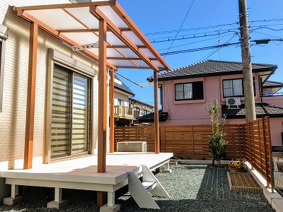 ナチュラルな雰囲気を醸し出すために木調仕様のテラス屋根と境界際に目隠しフェンスを取り付けしました。