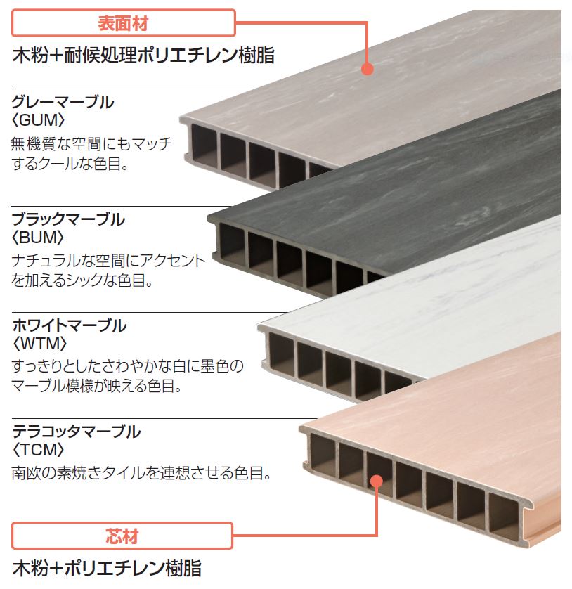 ホワイトマーブルやテラコッタマーブルといった一般的な木調デッキには無いカラーラインナップも魅力の1つとなっております。