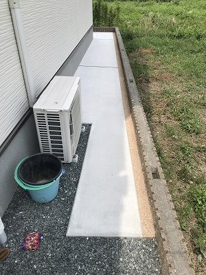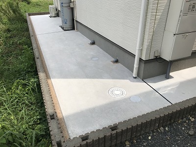 室外機下とガスボンベ下は現状のままとなりますが、それ以外はコンクリートと楽土でリフォームしました。雨水桝は高さを調整してから格子のある蓋に交換しました。コンクリート上に雨水が溜まらないように配慮しました。