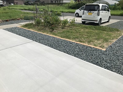 お施主様ご自身で防草シートを敷いて砕石を敷かれていましたが、毎年雑草が生えてしまいお困りでした。