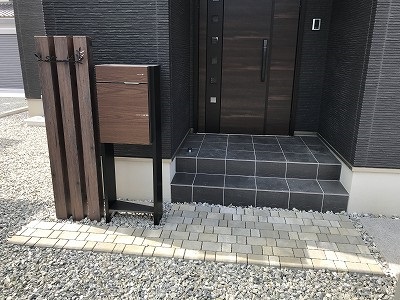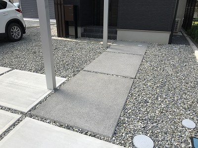砕石部分を多めにした駐車スペースとゆったりとお車を停められる大きさの2台用カーポートを設置、来客用の駐車スペースから玄関前までアプローチを設けて、郵便ポスト付の宅配ポストを設置しました。建物廻りは防草シートを敷いて砕石仕上げとなります。