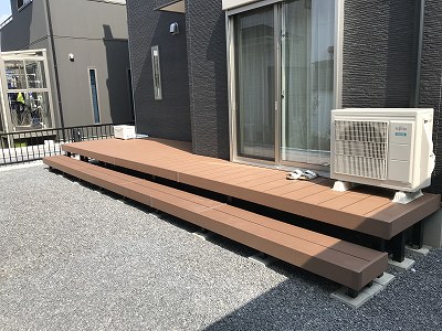 お庭には広々とした人工木デッキを設置しました。どこからでもお庭に出入りできるように、前面には2段デッキを設置しました。