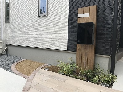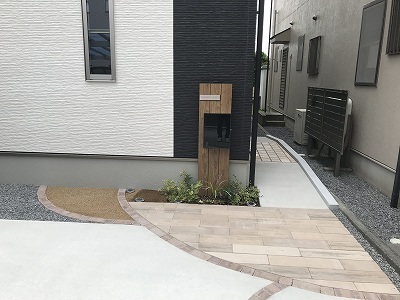 枕木材を使用したアプローチと玄関前にスロープを設けた外構工事をご紹介します。浜松市