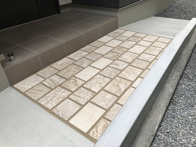玄関タイル前には天然石の敷材「東洋工業:ブエノストーン」を施工しました。色は「グレーベージュ」です。