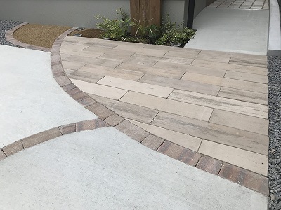 今回は「枕木材を使用したアプローチと玄関前にスロープを設けた外構工事」をご紹介します。