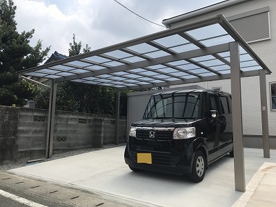 駐車場には2台用のカーポートを設置しました。屋根材は「熱線遮断ポリカーボネート板」を使用しました。