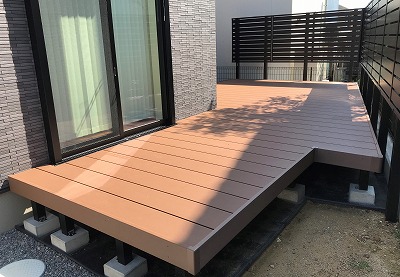 あとは人工木デッキです。お施主様とお打合せを重ねて敷地の形状に出来る限り合わせて施工しました。