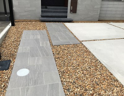 アプローチと来客用の駐車スペースとして「高強度タイル」を施工しました。