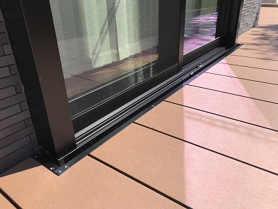 通常よりもデッキ本体が離れてしまってデッキ材の小口が見えてしまうので、オプションの「フラットレール対応部材」を設置しました。サッシ枠色と同系色で合わせたので、景観も綺麗です。