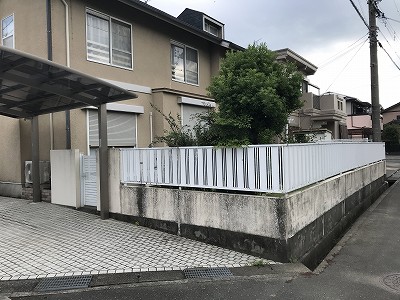 既存の壁を1部残しましたので、解体箇所は綺麗に補修をして高圧洗浄で出来る限り汚れを除去しました。今後建物のリフォームをご検討されているようでしたので、既存の壁を建物の壁と同色で再度塗装されてはとご提案しました。