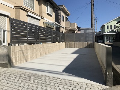 お庭と駐車場の高低差を解消する為に土留壁を施工しました。お庭で過ごされる際に視線が気にならないように目隠しとしてフェンスを設けました。