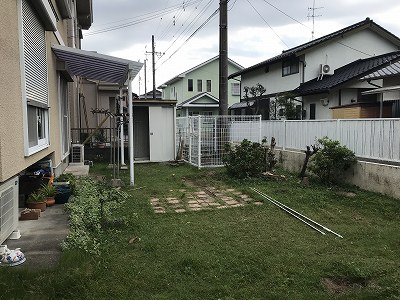 お庭の奥はテラス屋根と小型物置、ワンちゃん用のスペースとしてフェンスで囲まれていました。雑草等のお手入れが大変なご様子でした。