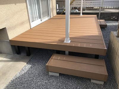 人工木デッキに人工芝側と物置側それぞれにステップを設けました。リビングからの出入りがしやすくなりました。