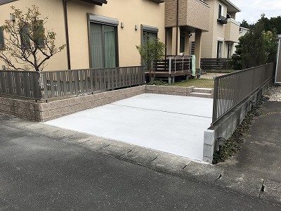 お車のバックドアの開閉時にブロックに当たらないようにコンクリートの仕上げの勾配を調整して仕上げました。