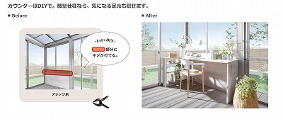 ガーデンルームGFはネジを打ち付けることができるので、デスクを取り付けたり、植栽棚を設置したり、室内を自由にアレンジすることができます。