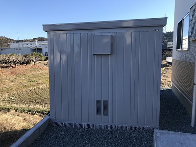 物置の側面には換気用としてオプション「メッシュ付壁パネル」を設置しました。上部はメッシュタイプとなっているので雨水が入りにくくする「メッシュパネルフード」も設置しました。