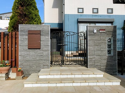 郵便ポスト付きの宅配ボックスとガラスブロックなどを埋め込み、