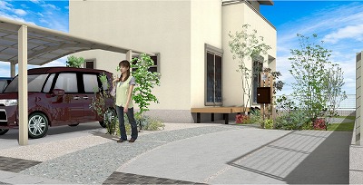 ↑↑↑こちらが今回プランさせていただきました、駐車場・アプローチのプランです。全体的に植栽の緑のバランス・植栽の成長を考え植栽を配置していきました自然あふれる中でも機能面やメンテナンス的にも配慮いたしましたプランとなっております。また場所によっては常緑樹・落葉樹を配置し、機能面等も考えながら配置いたします。
