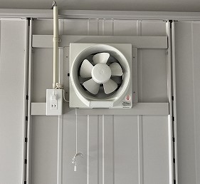 最後に「換気扇」のご紹介です。オプションでは「換気扇用パネル(枠)」のみの設定ですので、換気扇本体・電源・ガレージ外側の換気扇フードは別売りとなっています。換気扇設置をご希望の方は弊社で全てご用意させて頂きまして設置します。