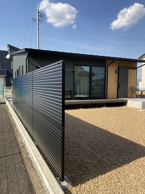 外部からの視線が気になる部分に目隠しフェンスを設置しました。1.8mの高さがあるので、歩行者の視線は十分カットできます。多段柱を使用して上下2段のフェンスを取り付けています。今回使用したフェンスは、視線を完全にカットしながら通風機能のあるルーバータイプです。
