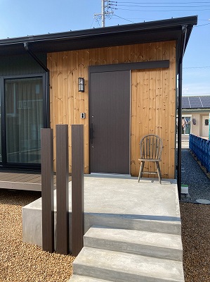 玄関ポーチの仕上げはタイル張りのお宅が多いですが、今回はモルタル仕上げで西海岸風に仕上げました。シンプルで無骨なデザインは男性に人気のスタイルです。